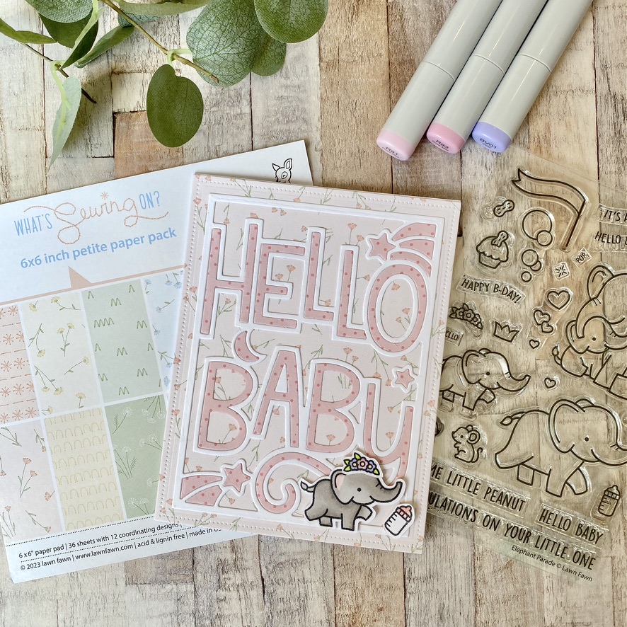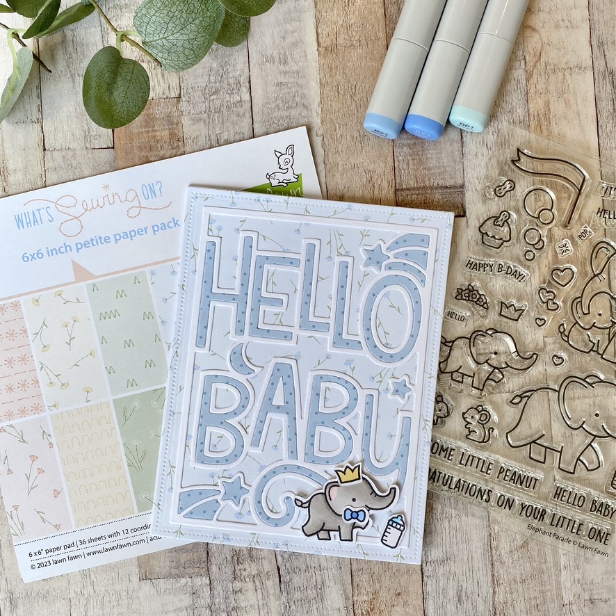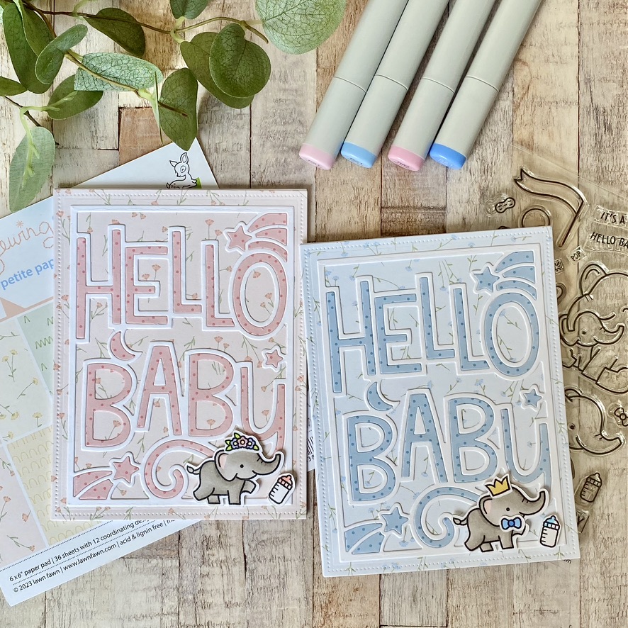 One of the new products in the latest Lawn Fawn release (Spring 2023) was a die called “Giant Outlined Hello Baby“. This die creates a giant sentiment that can be customised with patterned paper, cardstock, and glitter to name just a few. Lawn Fawn have released several different ‘giant outlined’ dies over the last few releases and they are great for quickly and easily making beautiful cards.